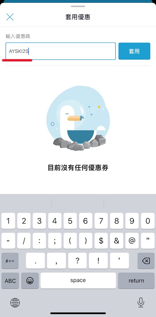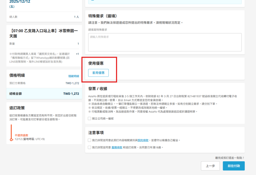 選好行程進入結帳畫面後,千萬不要手快直接付款!滑到下面會有一個「使用優惠」的欄位。