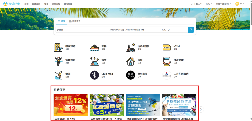 打開 AsiaYo APP 或網頁,就能在「限時優惠」看到近期活動&熱門住宿/行程推薦。